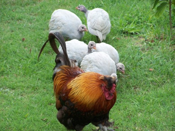 Why do we keep him? Why haven’t we shot him? I am not sure. I will say that a Doublewide Estate is not a home without a rooster. I remember my first rooster, Houdini, with great affection. He kept his hens safe. He could escape from any cage. He followed me as I gardened, waiting for me to throw him bugs as I weeded between the rows of squash. We were buddies. And even when his hens died, he hung around, a lonely old bachelor living for the moment I found a juicy cricket. When we made the mistake of adopting some baby guineas, he took to mothering them like an old hen. He gave his life for those guineas as he fought off some unknown predator. I found his lifeless body in the grass, feathers scattered everywhere, with the babies hiding under the butterfly bush next to the porch. As I shoveled a hole big enough to bury him with dignity, I wept silently. He was so beautiful and so funny. I loved that dadgum rooster as much as any horse, donkey, dog, or cat I have ever had.