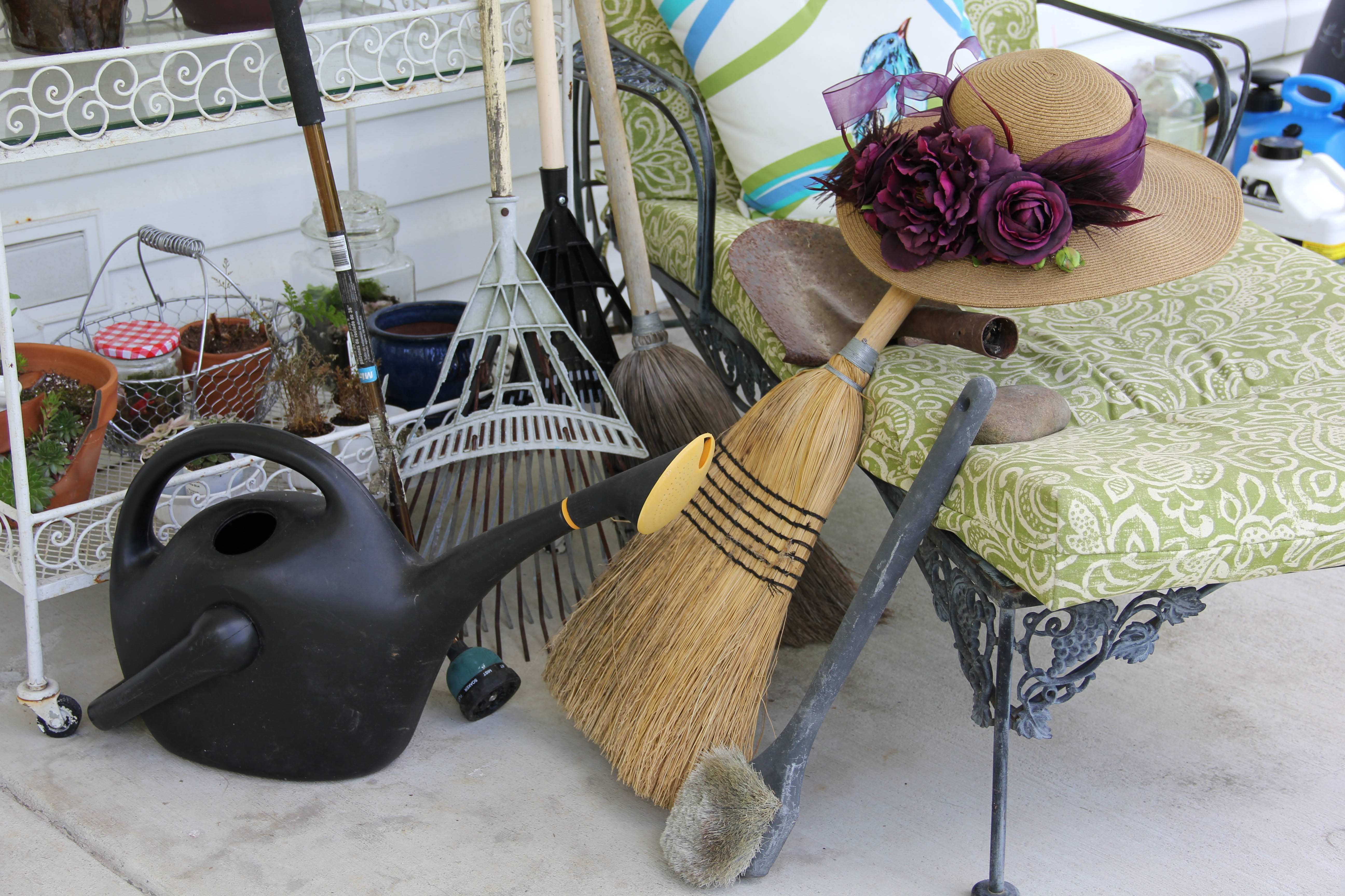 For your education and safety, I have assembled part of my anti-rooster defense kit. All of the following may be hurled or swung with great force: a watering can, a shower-head hose attachment, a rake, a broken rake, a broom, a shovel head, half of a broom, a rock, and a decrepit scrub brush. I have added a picture of an appropriate hat for rooster defense. If you do not understand the importance of wearing the appropriate hat, go back to my home page and click on Incident at a Turkey Shoot. Hats are essential. I would not hesitate to throw the chaise lounge if the situation warranted such action. No matter how hard you hit him, he just gets a little dizzy and walks away slowly with enough swagger to let you know that he could fight you if he so chose.